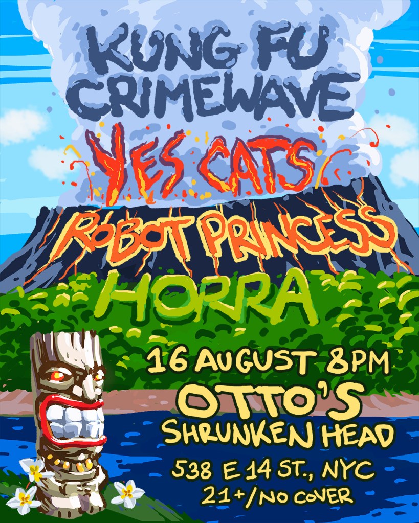 Yes Cats play a free show at Otto’s Shrunken Head with our friends Robot Princess, Kung Fu Crimewave, and Horra Saturday Aug 16th, music starts at 8pm sharp, Yes Cats at 9pm